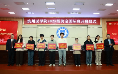 会见后,举行2025级美宝国际班开班仪式。谢书阳寄语2025级美宝班新生,要扎实掌握专业知识,积极培养创新思维,成就自己的人生理想。他强调,各教学职能部门及相关学院要高度重视美宝国际班的人才培养工作,持续深化产教融合的教育教学模式探索,助力美宝国际班本科教育实现持续创新发展。美宝集团(中国)副总裁商庆新介绍了美宝集团的发展历程和发展成效,并表示美宝集团将继续深化与滨医合作,为学生提供更多国内外学习机会,共同提升人才培养质量;并勉励同学们传承奋斗创新精神,争做卓越医学人才。8位美宝奖学金获奖同学代表接受颁奖,美宝奖学金获得者代表王涵、赴美访学学生代表孔浩然、新生代表龙永浩分别发言。美宝国际班学业导师徐飞博副教授发言并带领美宝班全体新生诵读医学生誓言。